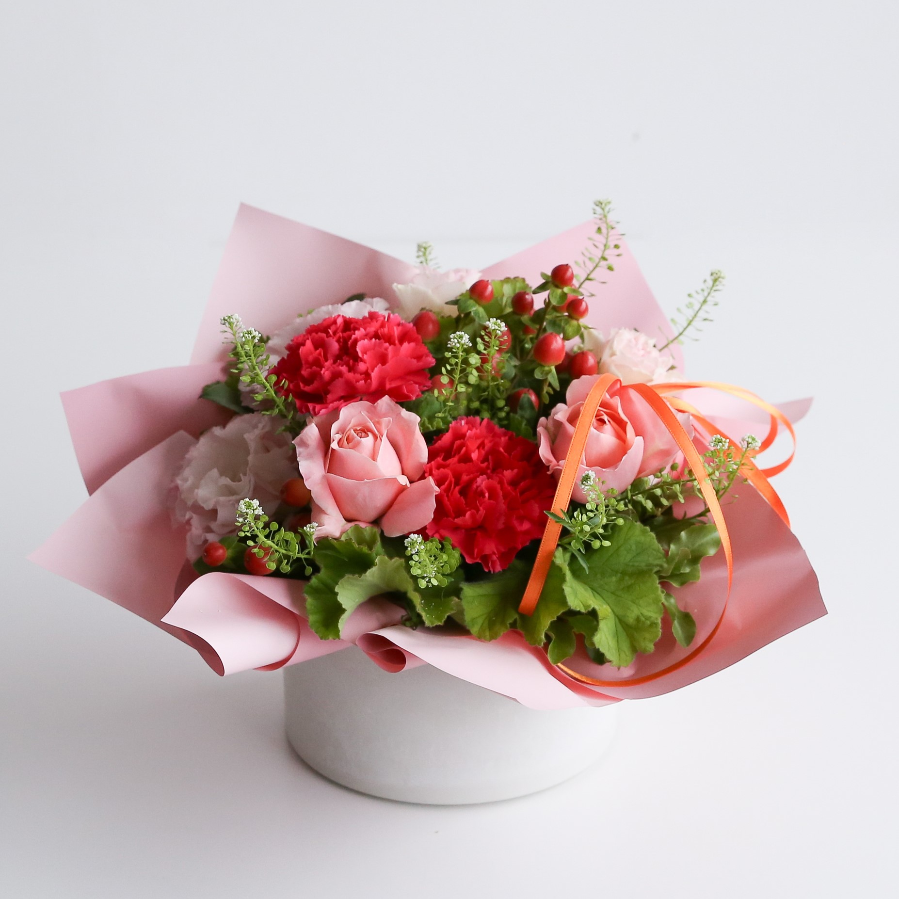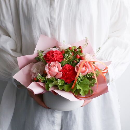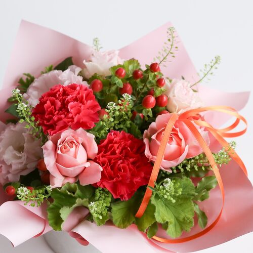 母の日らしいカーネーネーションやミニバラの組み合わせで届いた状態のまま長くお楽しみいただけるデザインです。