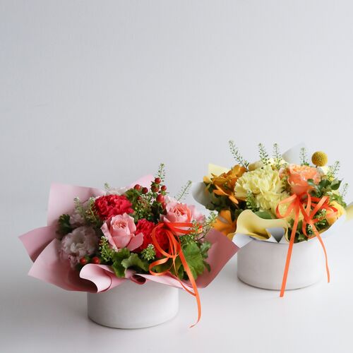 ・使用花材:カーネーション(イエロー)・ミニバラ・小花・グリーン(ゼラニウム)など