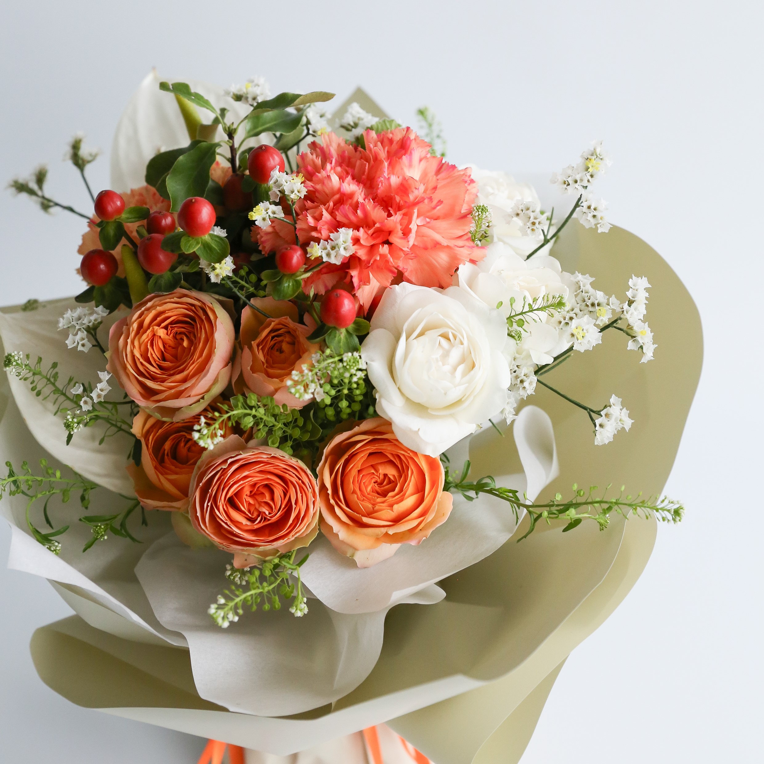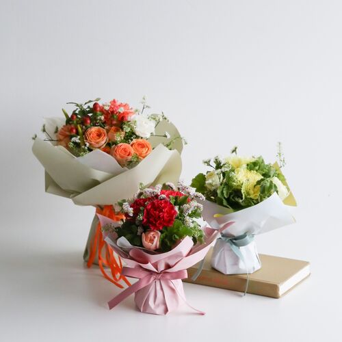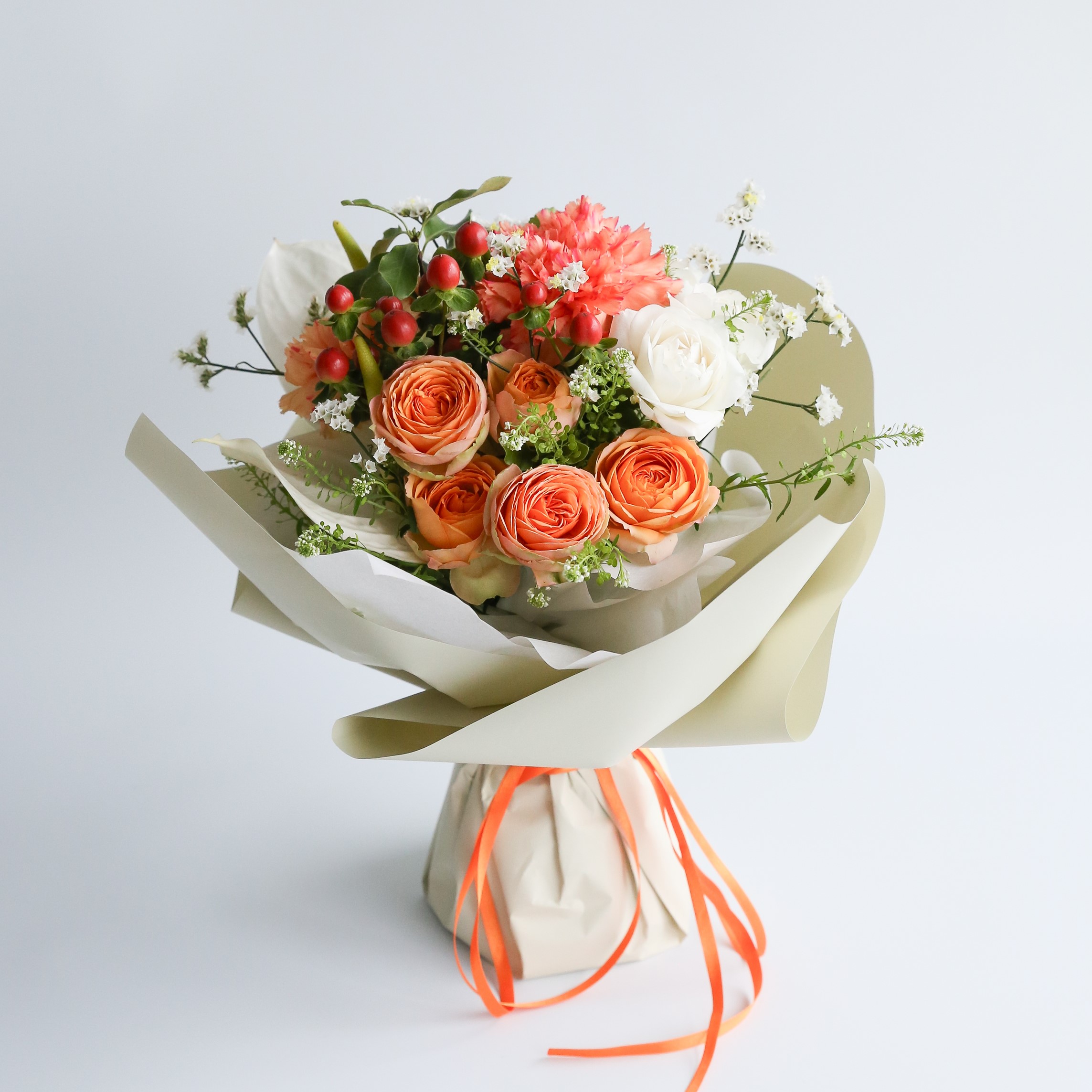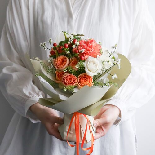 ・使用花材:カーネーション(オレンジ)・ミニバラ・アンスリウム・小花・グリーン(ゼラニウム)など
