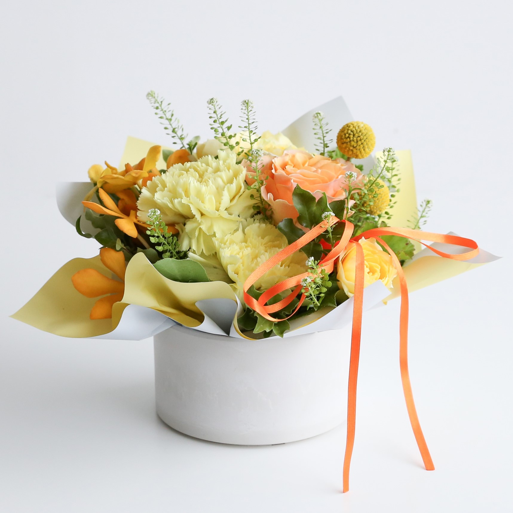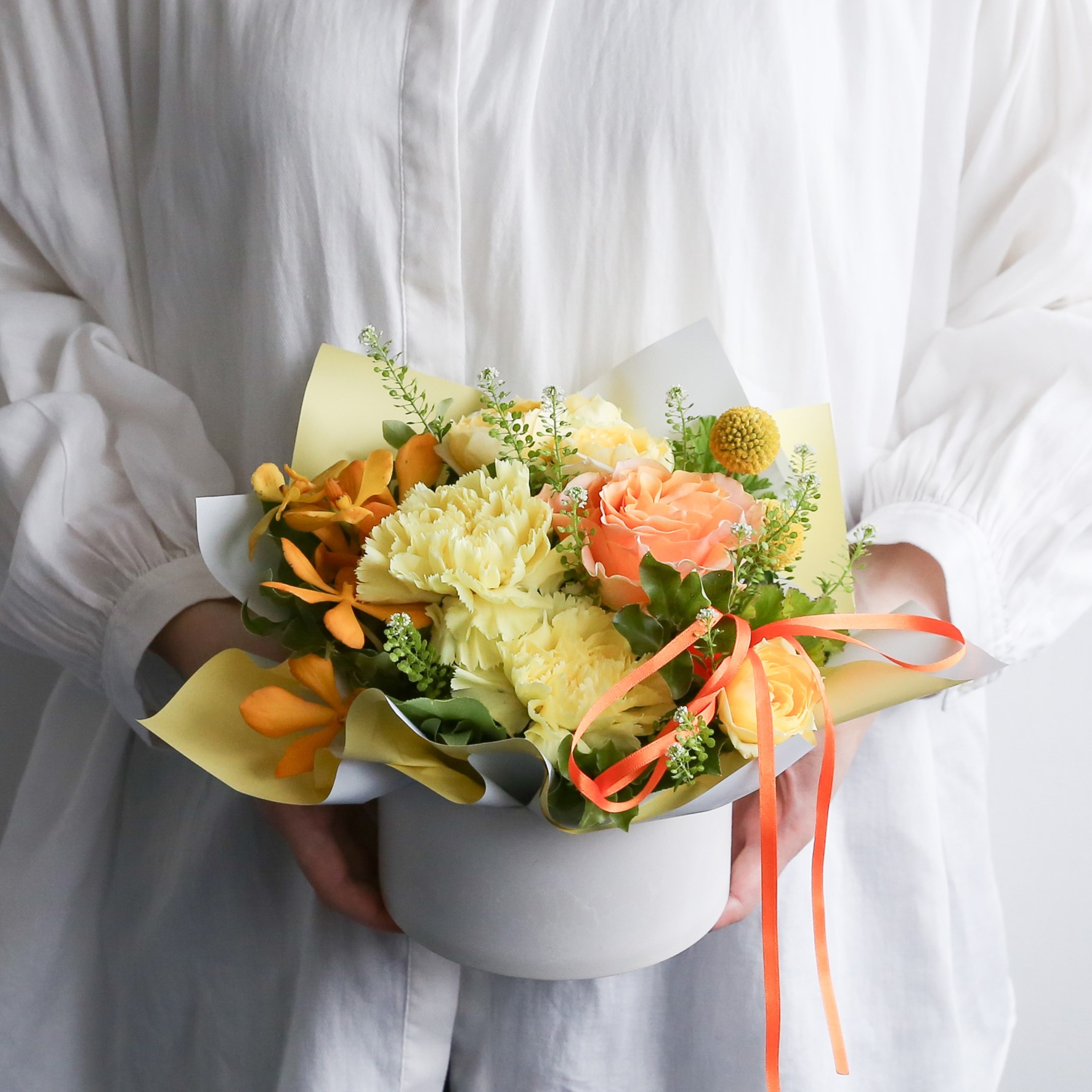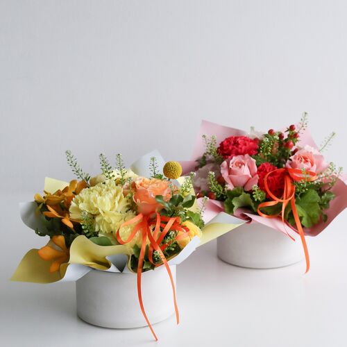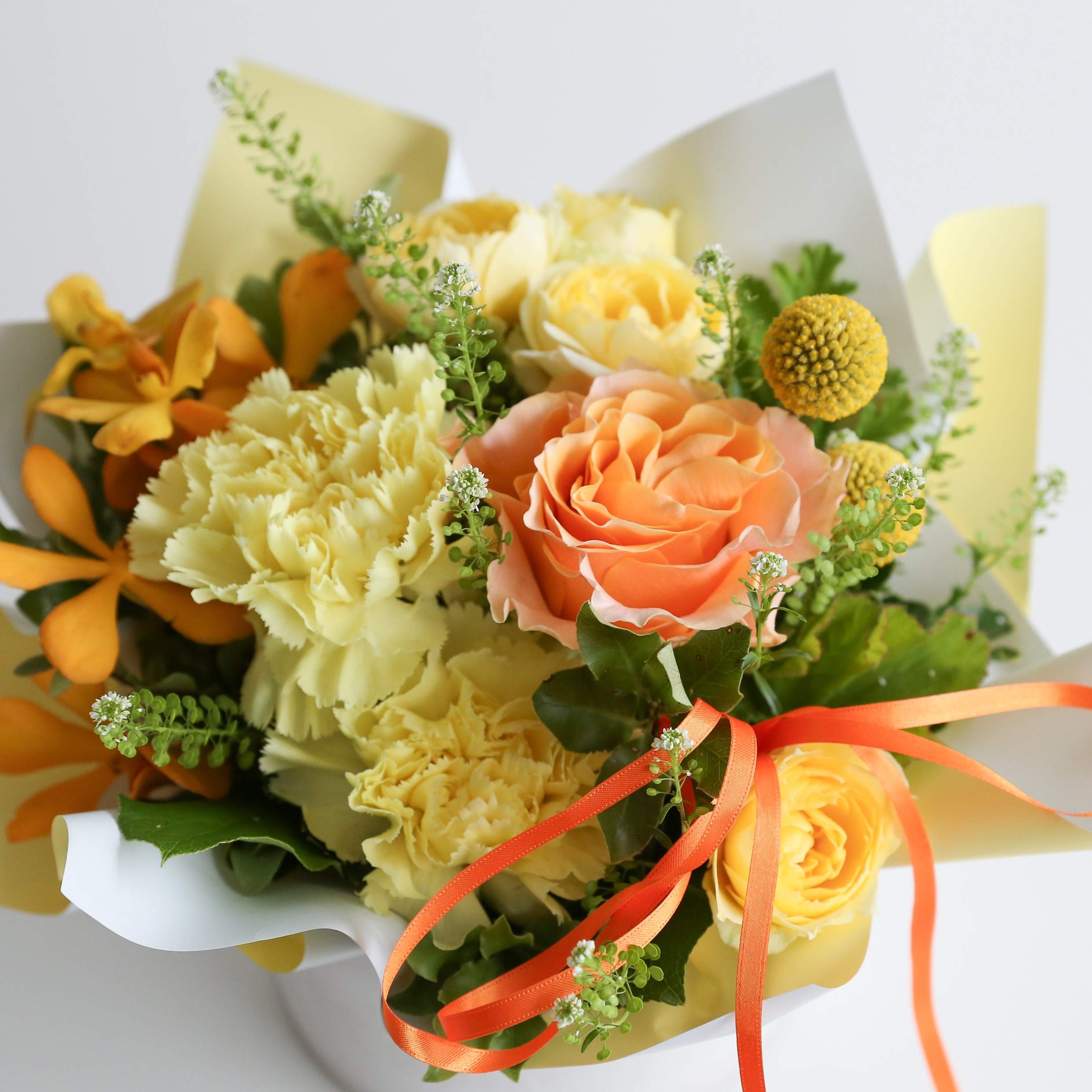 ・使用花材:カーネーション(イエロー)・ミニバラ・小花・グリーン(ゼラニウム)など